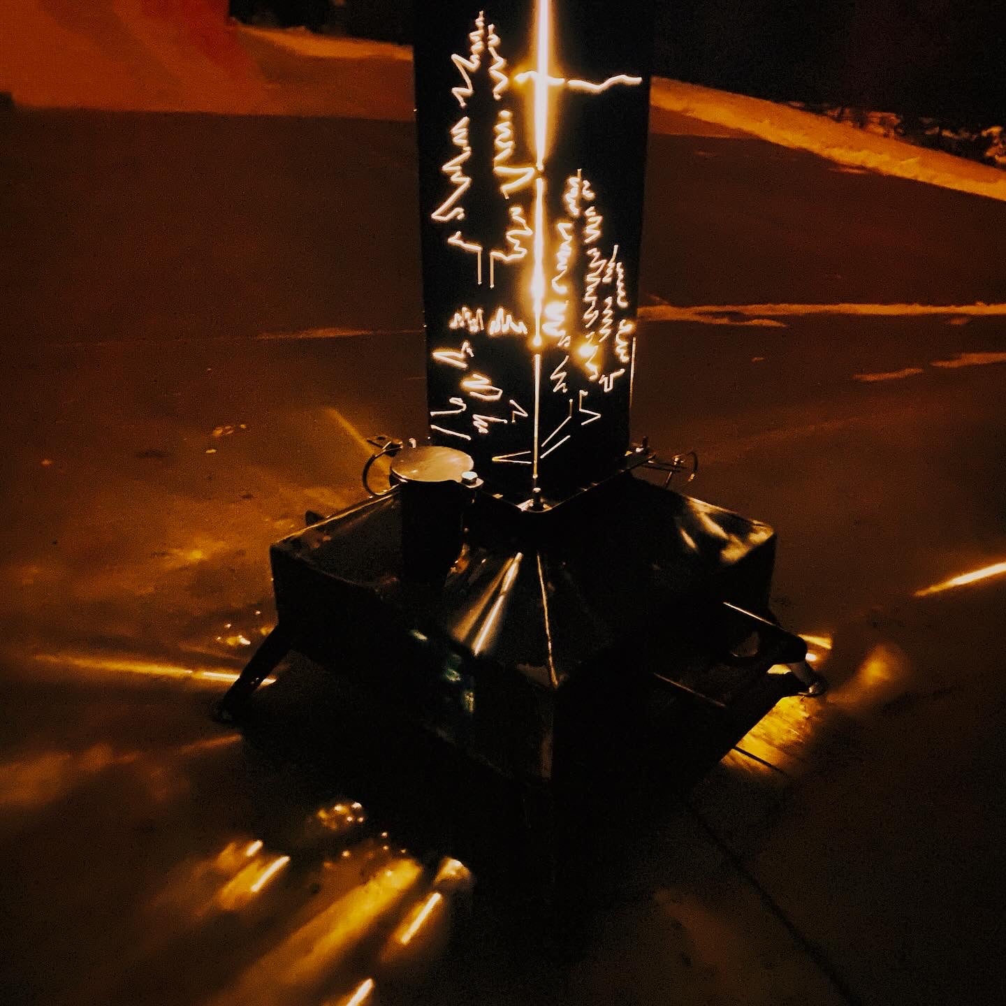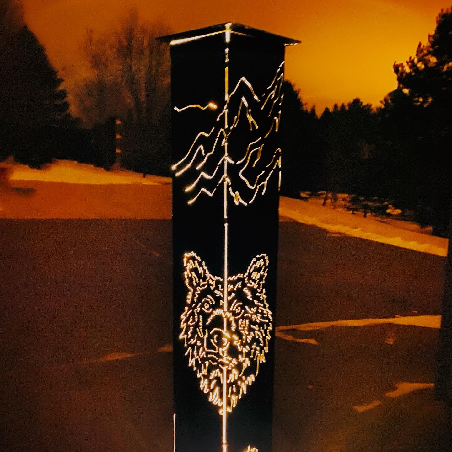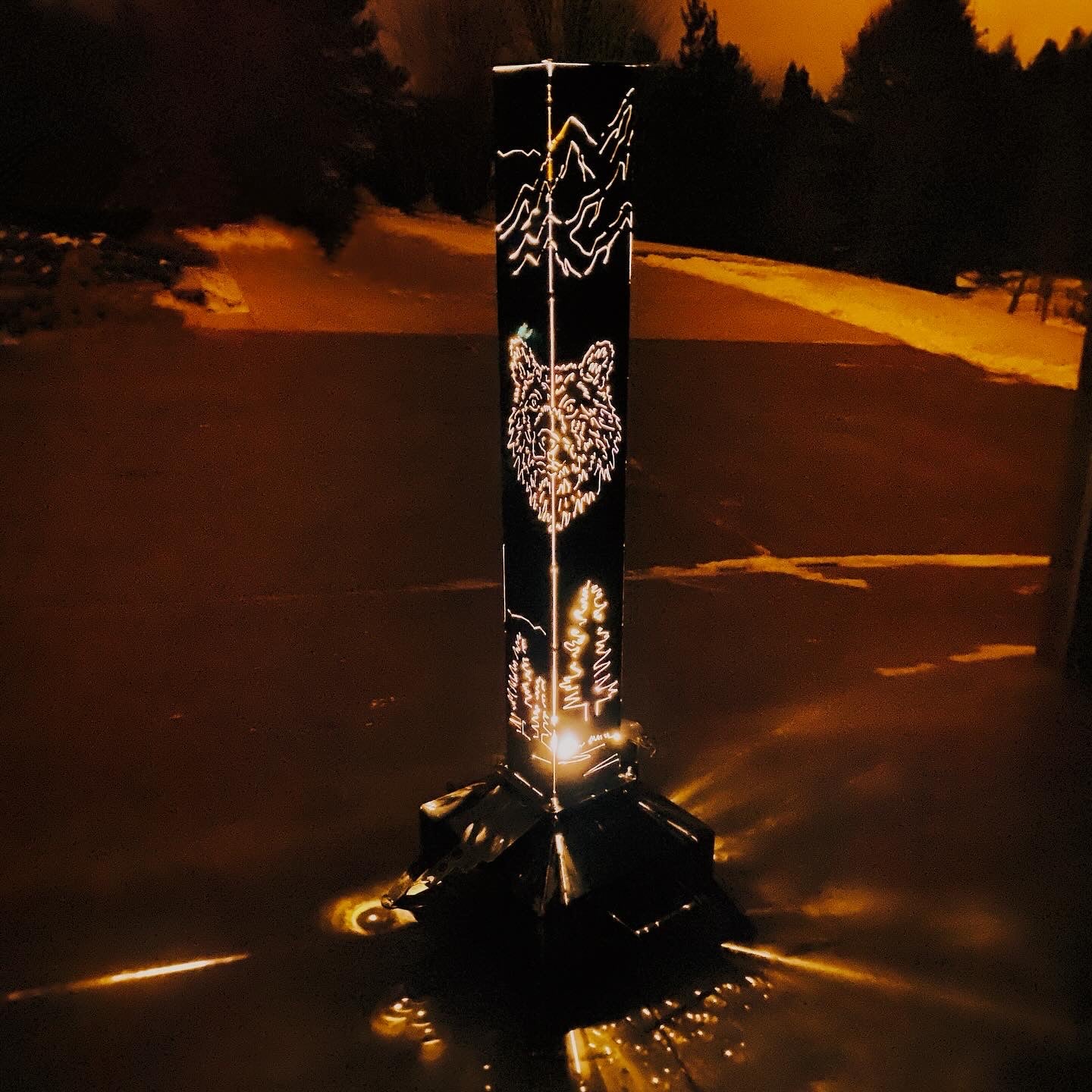 Fully welded ready to use Smudge Pot . Pick from a 5 gallon or 10 gallon base. Both bases have a 20” x 20” footprint. This 48" Chimney comes with a Deer and Bear, pine trees on the bottom and mountains on top.