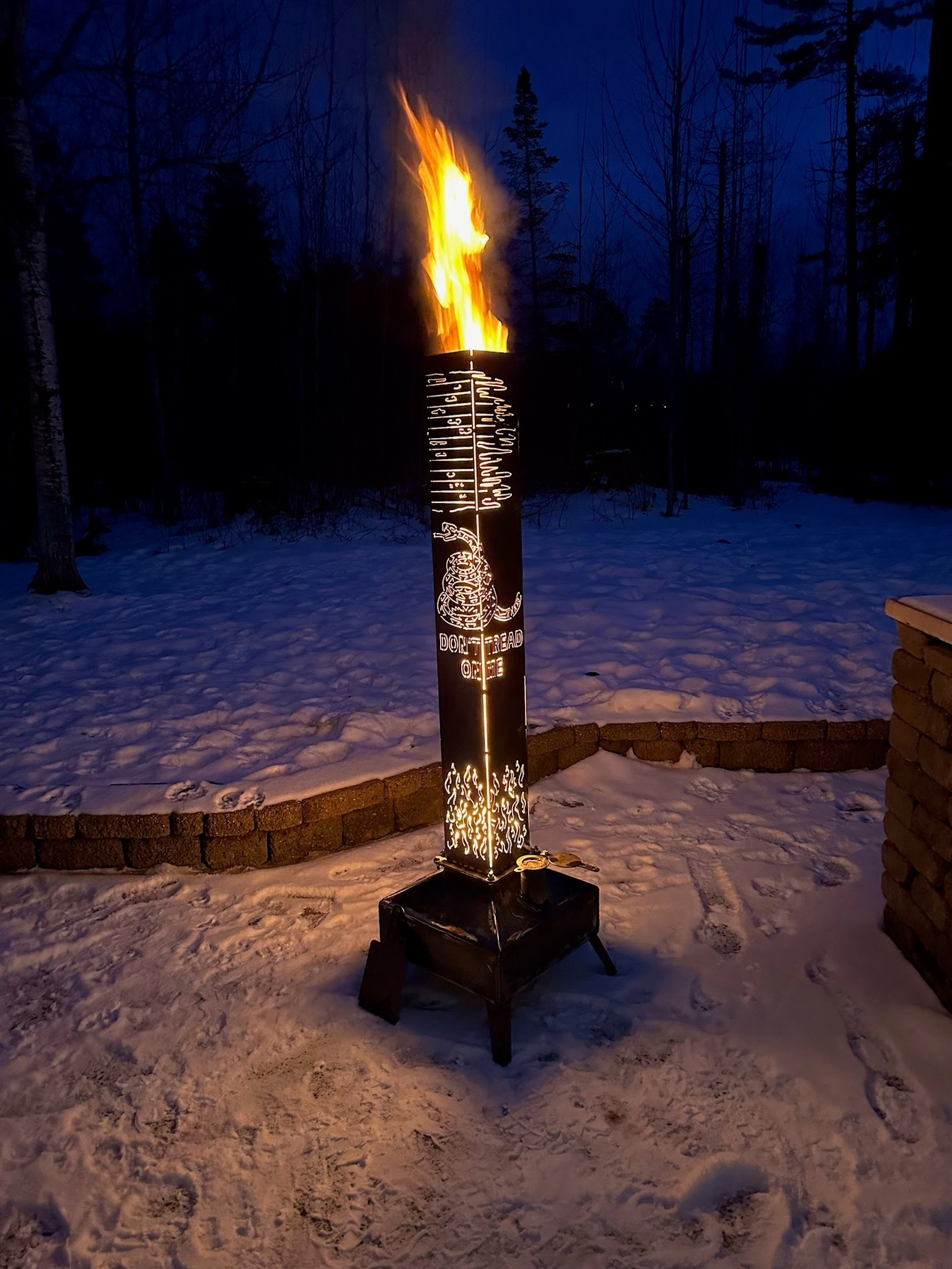USA DIY Smudge Pot weld it Yourself and save. Pick from a 5 gallon or 10 gallon base. Both bases have a 20” x 20” footprint. This 48" Chimney comes with Don't Tread On Me, American Flag on top, flames on bottom. All parts are CNC cut and easily bent by hand with relief cuts designed in, the chimney comes pre-bent, tack it all together then final weld it.