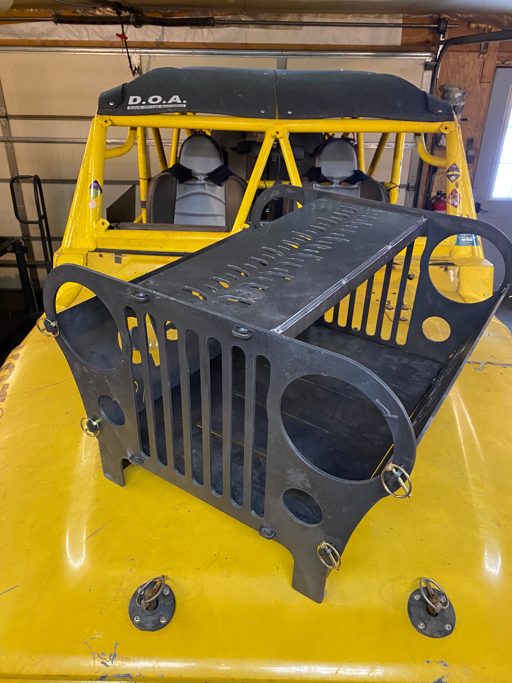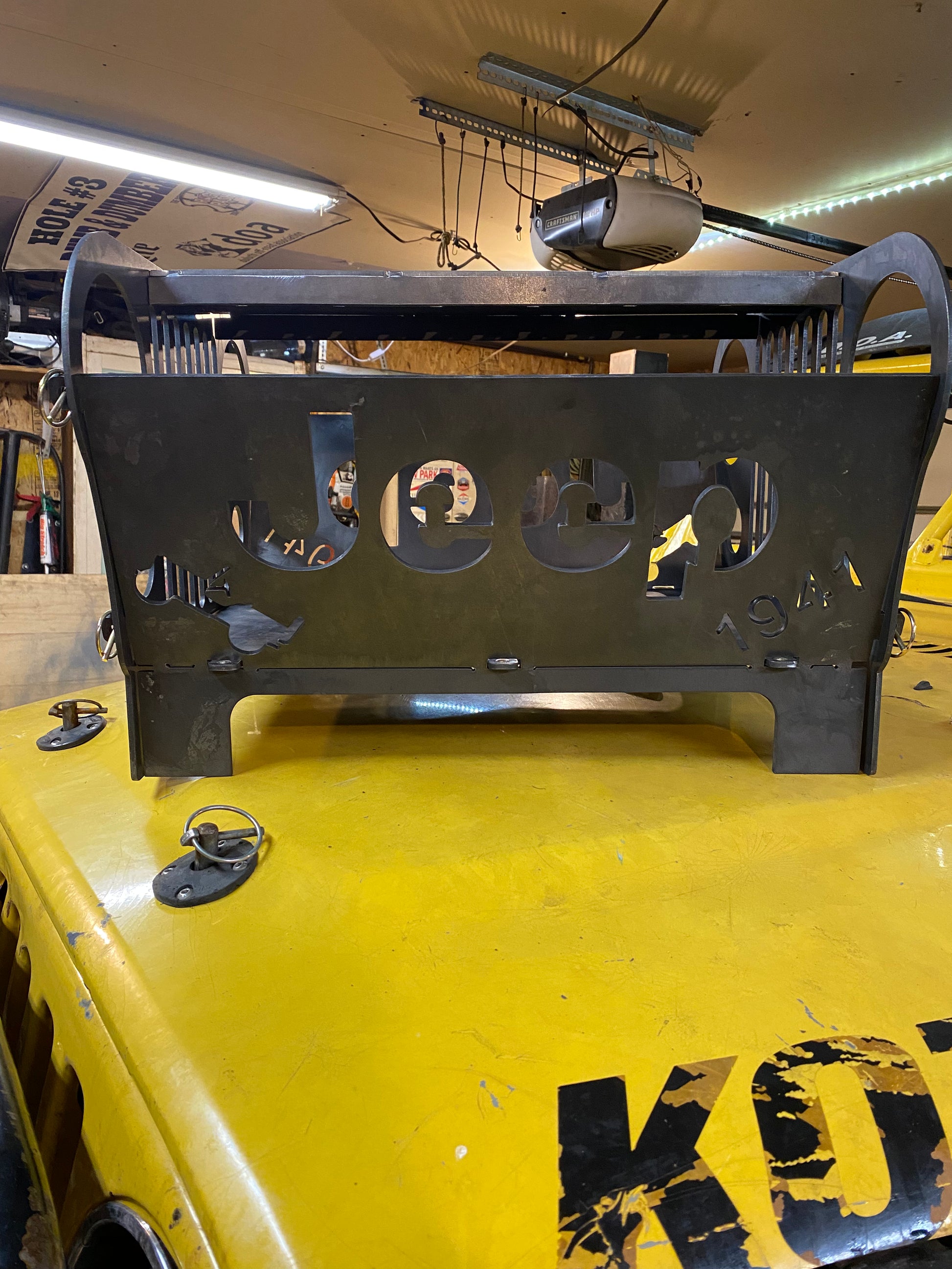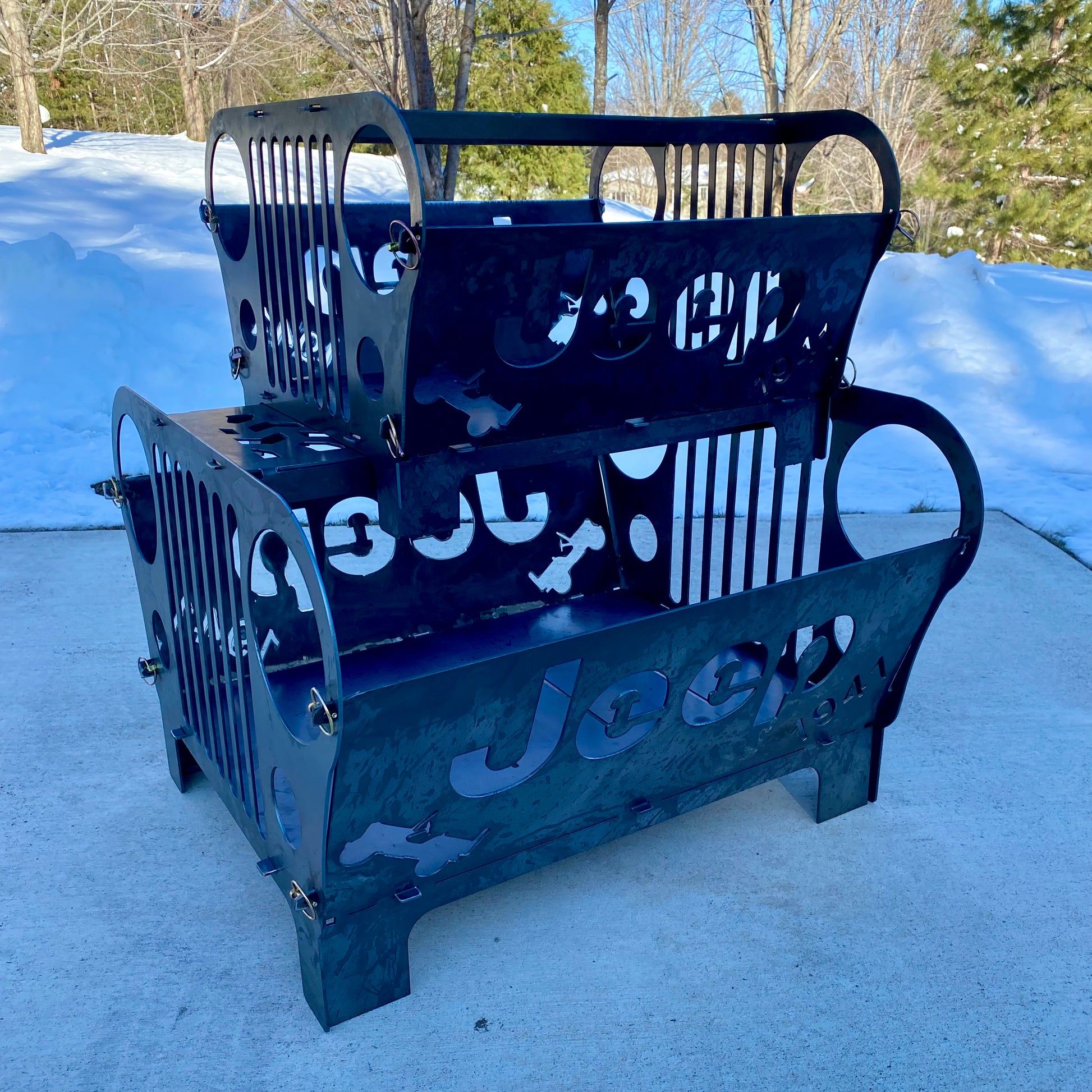 Collapsible Jeep Fire Pit made from 1/8" thick steel or 3/16" thick steel. Choose from Bogger or TSL tire pattern on the top grate and select if you want a 23"x23" fire pit or a 31"x31".