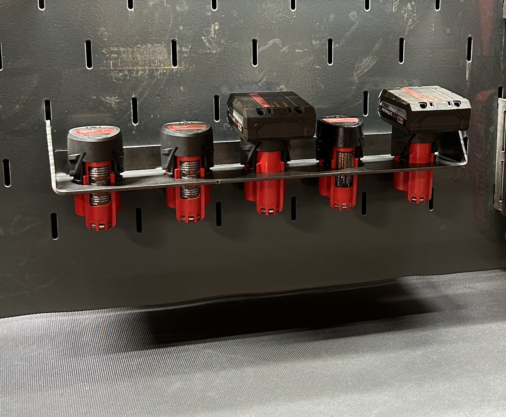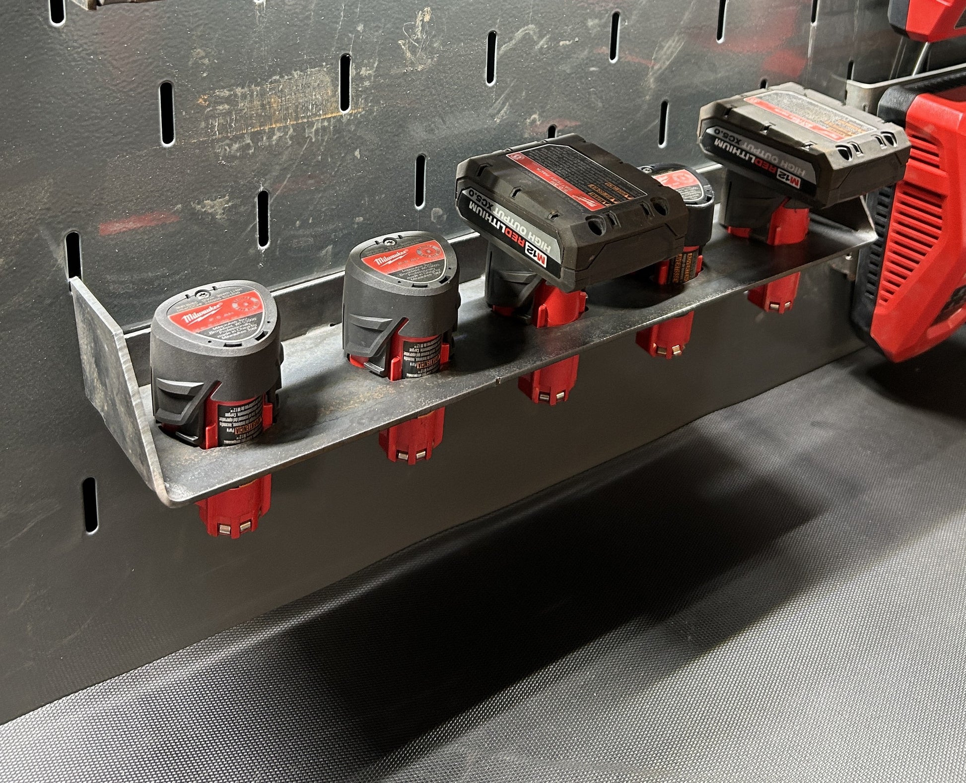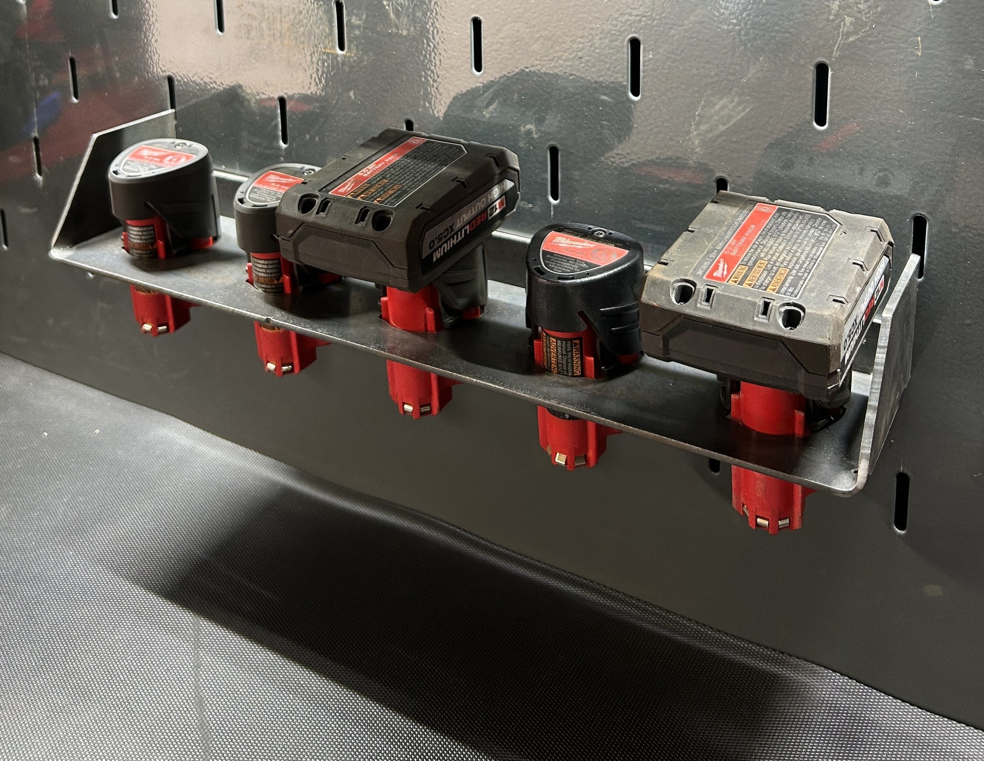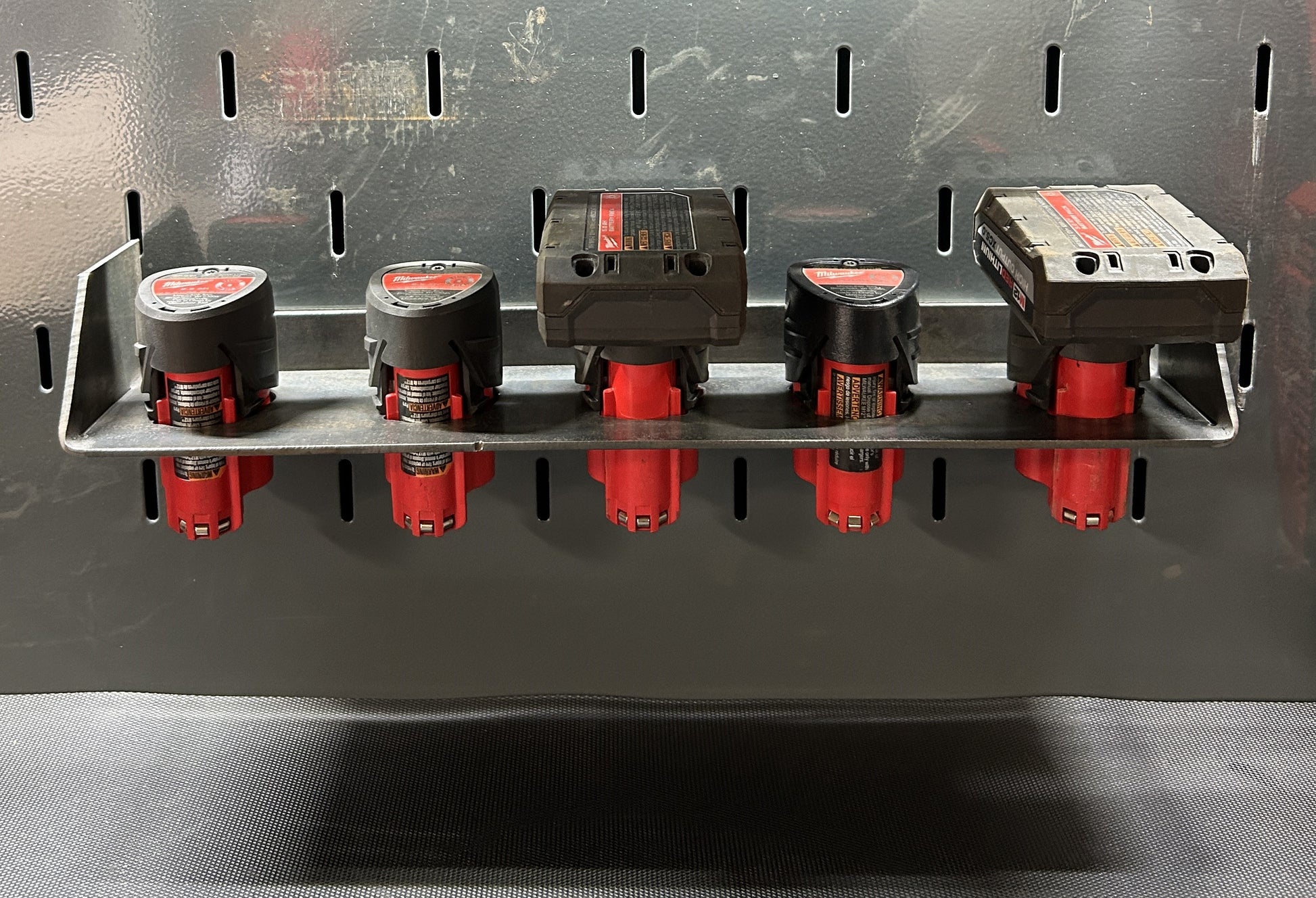 One Milwaukee 12v Battery Mount, holds five 12v batteries. Mounts to Icon, US General & Snap On, will work with other vertical slot mount systems with 3" spacing horizontally.