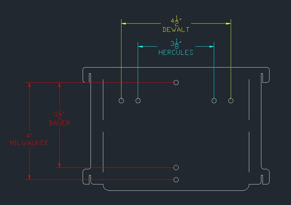 One Universal Charger Mount for single battery chargers - Bauer, Dewalt, Hercules, Makita, Milwaukee. Mounts to Snap On side cabinets and hutches, will work with other vertical slot mount systems with 3" spacing horizontally and 3" spacing vertically.