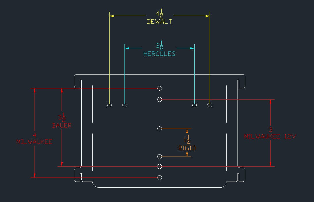 One Universal Charger Mount for single battery chargers - Bauer, Dewalt, Hercules, Makita, Milwaukee, Ridgid. Mounts to Icon & US General Hutch, will work with other vertical slot mount systems with 3" spacing horizontally.